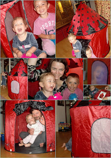 Och måånga paket hade de med sig. Och Molly blev så överlycklig över vartendaste ett. Det skrattades högt och hon skulle visa alla vad hon hade fått! Pippi och gänget, Pippi-film, drake som ryter, söta, smutsiga hundar som kan tvättas, massvis med plastfrukter och grönsaker, plastbestick, dockstol, dockskötväska, dockpotta och fina kläder. Jag har säkert glömt något men Molly var helnöjd! :-)